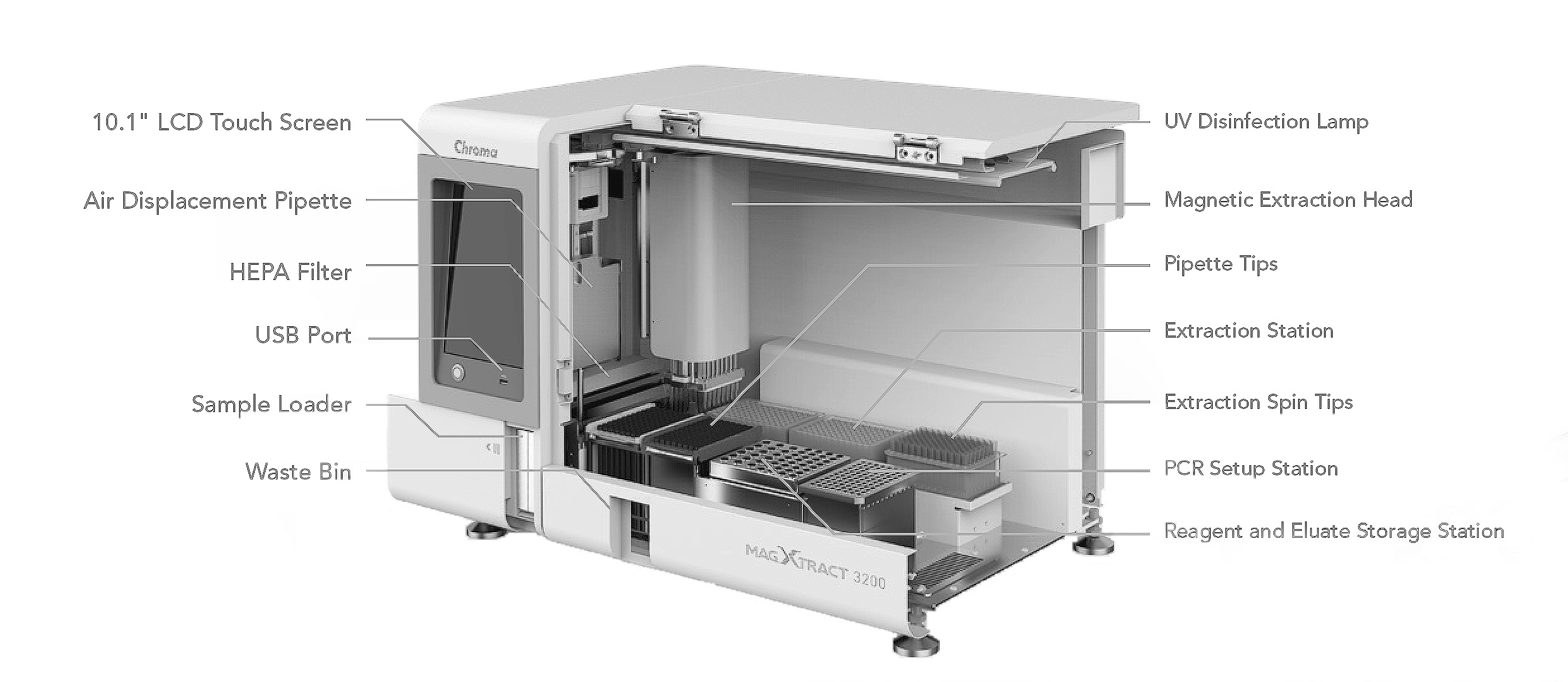 MagXtract 3200 is a novel one-step automated system for PCR sample preparation, performing nucleic acid purification and PCR setup in a compact bench-top workstation. The state-of-the-art technology seamlessly integrates nucleic acid purification with liquid handling capabilities to achieve fast, efficient, flexible, and reliable PCR sample preparation.